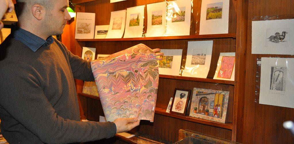 In the workshop producing Florentine hand-decorated paper, kids are shown the historic process of “marbleizing” paper. This process was probably created in China or Japan, introduced in Europe in the late 1500. Children will be amazed at how from a few drops of color, so many different patterns can be created!