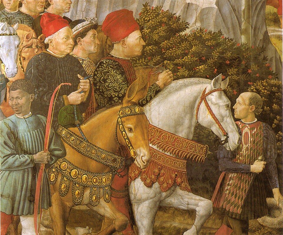 In this Medici fantasy, Balthasar is associated with John VII, Emperor of Constantinople, who was in Florence during the Council in 1439, stunning everyone with his entourage of Eastern intellectuals, princes and handsome pages. The allusion to the Emperor of Constantinople is particularly impressive if the we connect the figure to Piero the Gouty, possible the most “princely” heir of the Medici family. Just like Balthasar, Piero loved riding horses, superb clothes and collecting precious art objects. Benozzo is very clear in presenting this magus as the most “royal” of the three kings.
