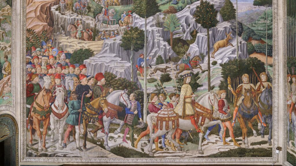 In this context, the Medici could be seen as “kings of kings”, because each year the family sponsored a sumptuous Magi parade held on Epiphany day (January 6). It started from San Marco – the convent whose reconstruction Cosimo the Elder had funded – and ended at the Baptistery. The whole parade would slowly proceed through via Larga (now via Cavour), the street where the Medici palace stands, in an elegant display of colors, magnificent outfits and knightly splendor.